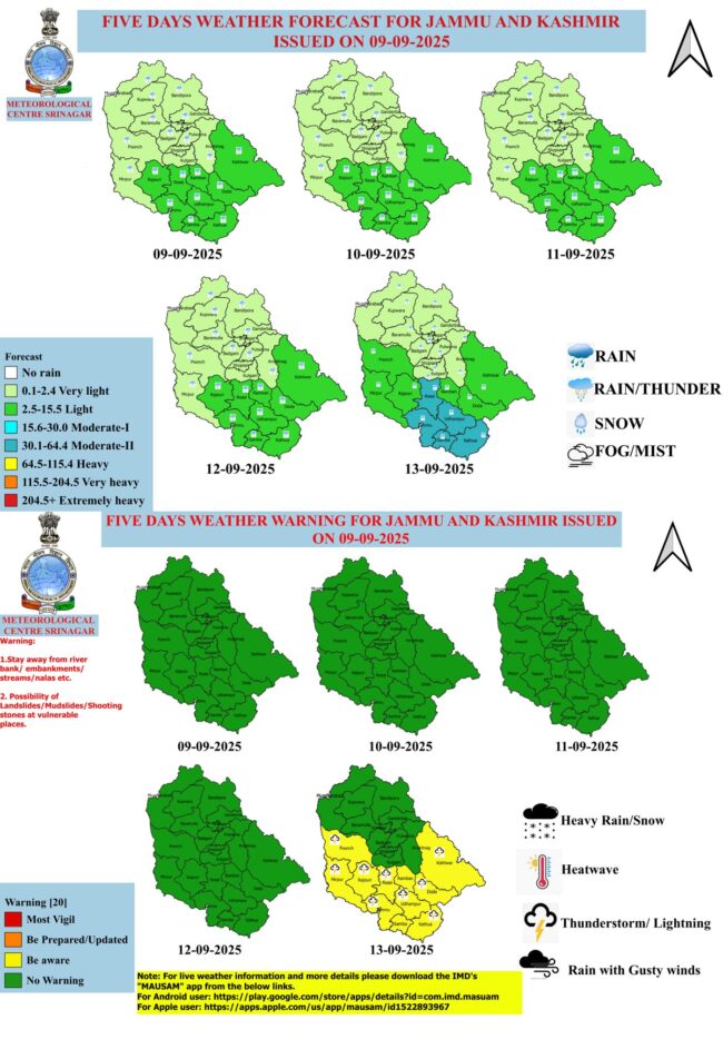 ●13 Sept:Possibility of one or two spells of light rain/thunder at many places with moderate showers over few dists of JMU Div.
