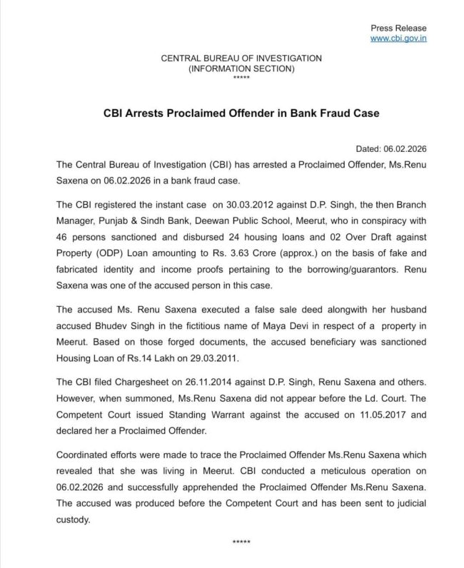 HomePoliceCBI Arrests Proclaimed Offender in Bank Fraud Case Jammu Tawi deskFebruary 6, 2026 6:42 pm 0 CATEGORIES CrimeLatest NewsPolice Share ThisAUTHORJammu Tawi desk