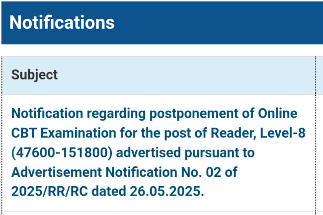SRINAGAR, AUGUST 27: According to a notification issued by the Registrar Recruitment, J&K High court, in view of the inclement weather and heavy rainfall, it is hereby notified for information of all the candidates who had to appear in the online CBT Examination for the post of Reader, Level-8 (47600-151800) advertised pursuant to Advertisement Notification No. 02 of 2025/RR/RC dated 26.05.2025, that the examination for the said post which was scheduled to be held on 28.08.2025 in different centers both at Jammu and Srinagar, stands postponed and shall now be conducted on 13.09.2025.