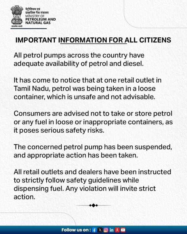 Petrol and diesel are adequately available at retail outlets across the country. Consumers are advised not to take or store fuel in loose or inappropriate containers, as it poses serious safety risks.